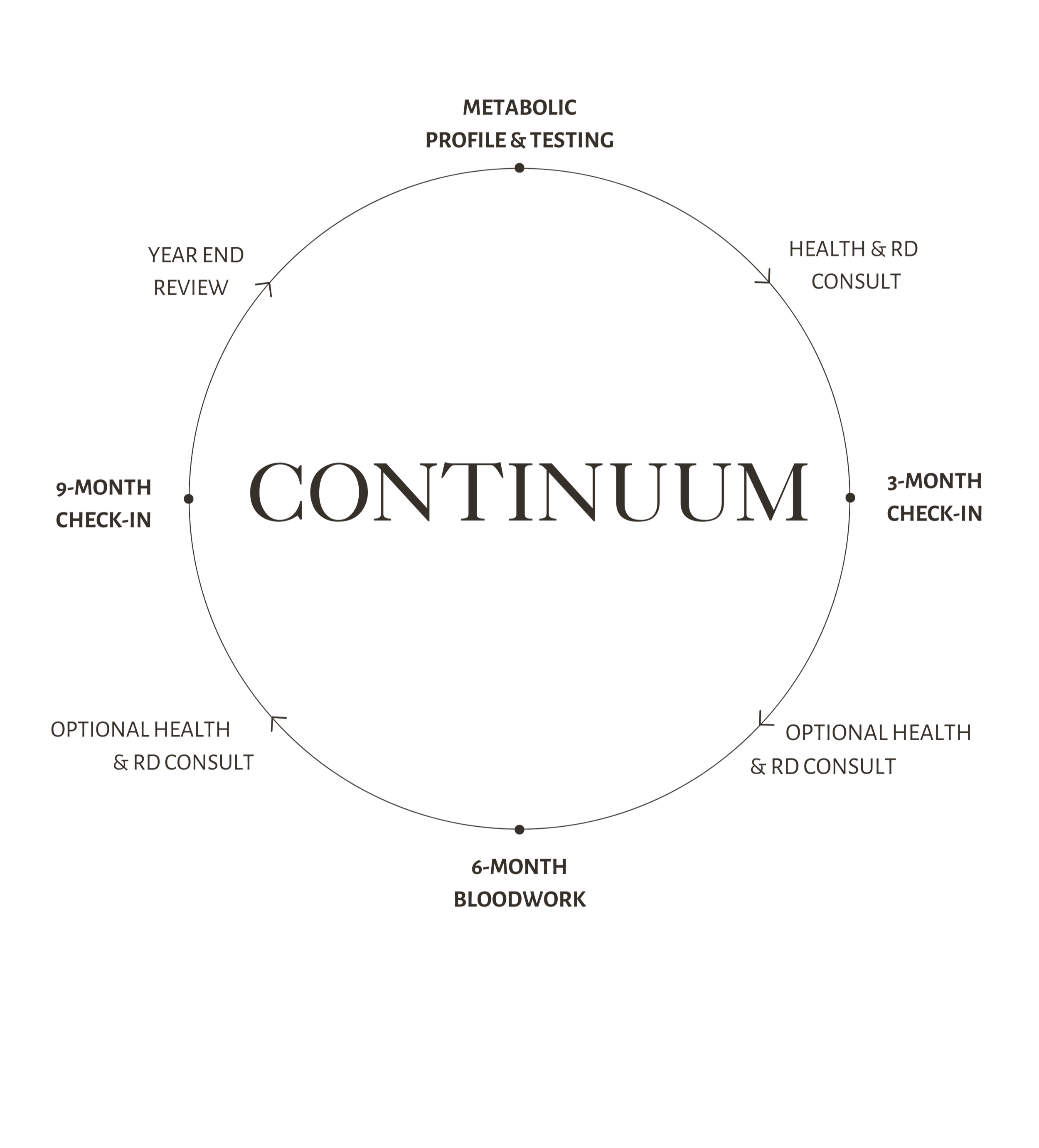 Meet 1-on-1 with your Continuum Metabolic Health Advisor (M.S. Biochem, FBCA certified, Mayo Clinic–trained Health Coach) and your Registered Dietitian Partner.